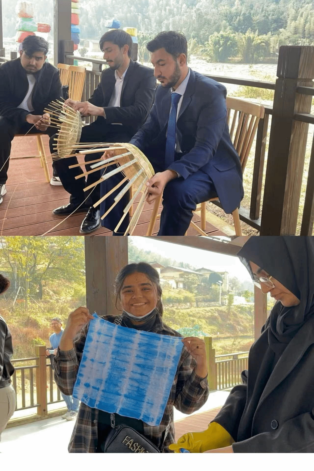 活动中,学生们首先了解了数字游民村的发展理念与生活方式。通过非遗传承人的现场讲解,留学生们学习了客家蓝染的历史渊源与工艺技法,并在指导下亲手进行扎染创作,每人完成一块小方巾作品,还共同合作染制了大型布幅。此外,大家还体验了客家竹编,动手制作简易杯垫与小竹筐。