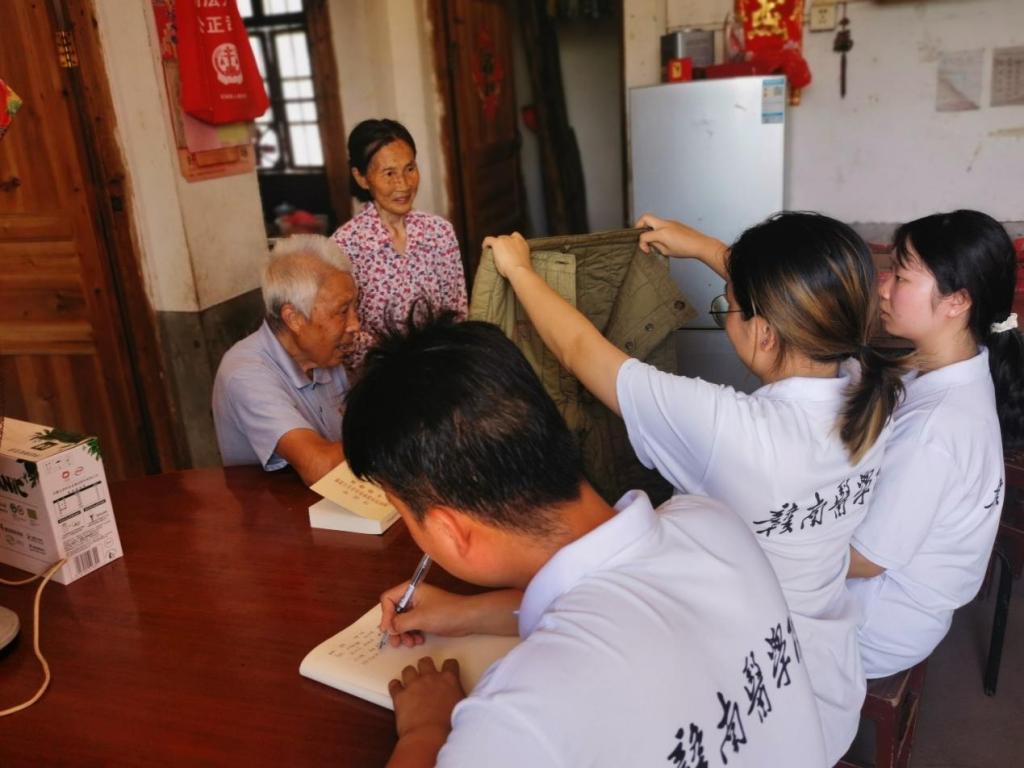 7月17日实践队员在丹溪村拜访了李盛行、杜福森两位老党员,两位老爷爷详细地向队员们讲述了年轻时为国奋斗、为党奉献的人生故事。李盛行还向实践队员们展示了他当年在部队里发放的棉裤,他一直舍不得穿,完整的保存了近50年。对话中,队员们仿佛穿越时空,与他们一起经历峥嵘岁月,接受红色精神的洗礼。在他们身上实践队员看到了共产党员艰苦朴素的高贵品质和不懈奋斗的精神。