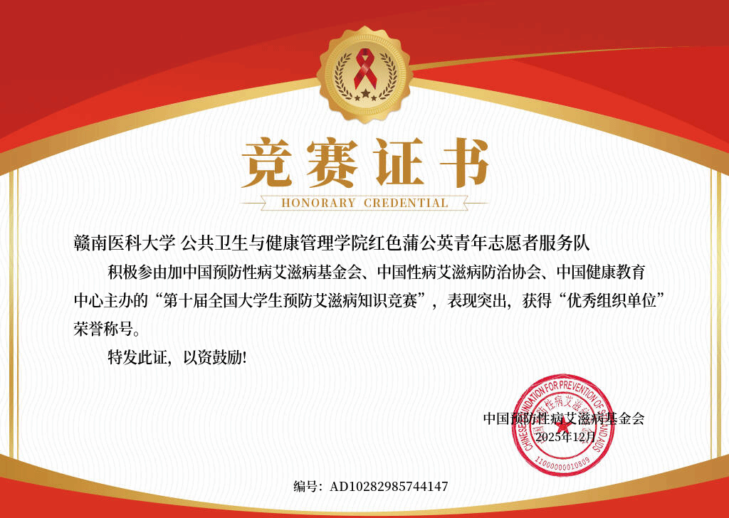 近日,第十届全国大学生预防艾滋病知识竞赛评选结果正式揭晓,我院红色蒲公英青年志愿者服务队凭借扎实的组织工作、广泛的动员参与和显著的宣传成效,荣获“优秀组织单位”荣誉称号。在本次比赛中,红色蒲公英青年志愿者服务队累计组织全校10445名同学参与线上艾滋知识答题,答题准确率高达99.76%,参与规模与答题质量均位列全国高校前50名,展现出我校学子扎实的健康知识基础和积极的社会参与意识。