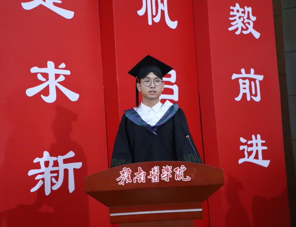 基础医学院2017级临床医学专业本科(8)班黄烈豪、国际教育学院2018级临床医学专业硕士研究生OUMAROU MOUSSA和第一临床医学院2019级临床医学专业张秀芳分别代表本科、留学生和研究生毕业生发言。他们纷纷表达了对母校的感谢和眷恋之情,并祝福母校越办越好。