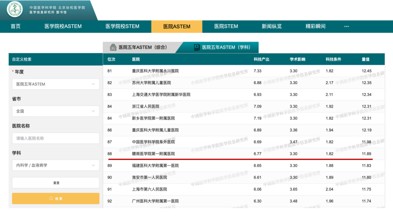 8月4日,中国医学科学院重磅发布“2021年度中国医学院校/中国医院科技量值(STEM)暨五年总科技量值(ASTEM)”,我校一附院血液内科在五年总科技量值血液病学中排名全国第88名,江西省第2名,是赣州市唯一进入全国百强的学科。