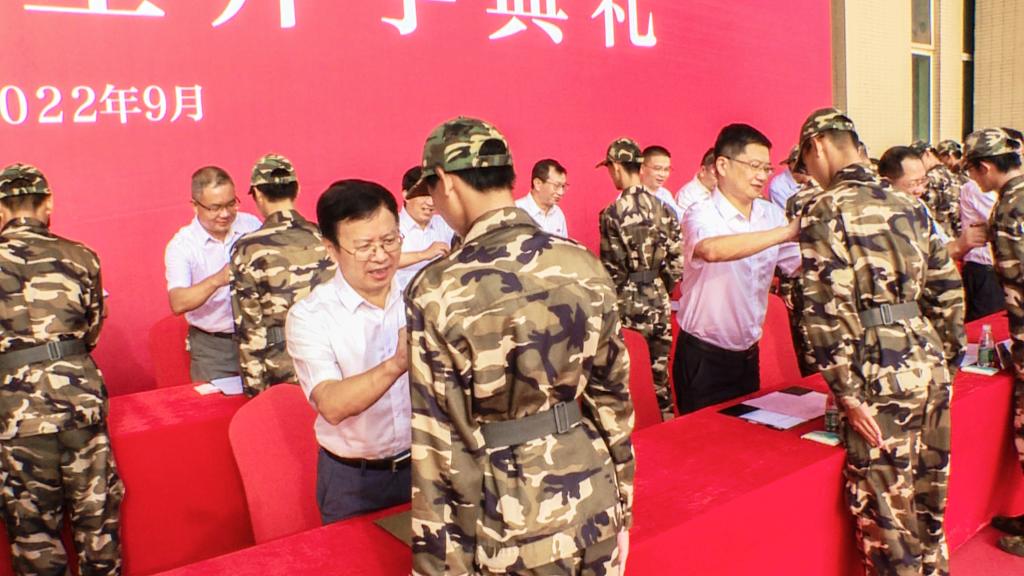 在主席台就座的领导为新生代表佩戴校徽,全体2022级新生气宇轩昂,充满对未来校园生活的期待。