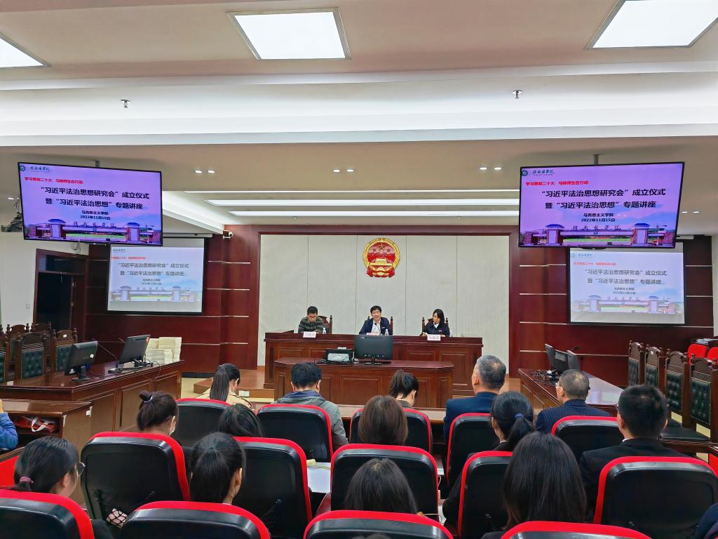 廖志平在致辞中指出,习近平法治思想是习近平新时代中国特色社会主义思想的重要组成部分,党的二十大报告首次单独把法治建设作为专章论述、专门部署,充分体现了以习近平同志为核心的党中央对全面依法治国的高度重视,成立“习近平法治思想研究会”,正是大好时机。廖志平希望研究会成立后,能结合马克思主义学院法学学科教学和实践任务,带头弘扬社会主义法治精神,带头传承中华优秀传统法律文化,带头开展法治宣传教育,带头开展理论研究和理论阐释,早见成效,早出硕果,真正使习近平法治思想深入人心,使遵法守法学法用法在全校全社会,在广大师生中蔚然成风。
