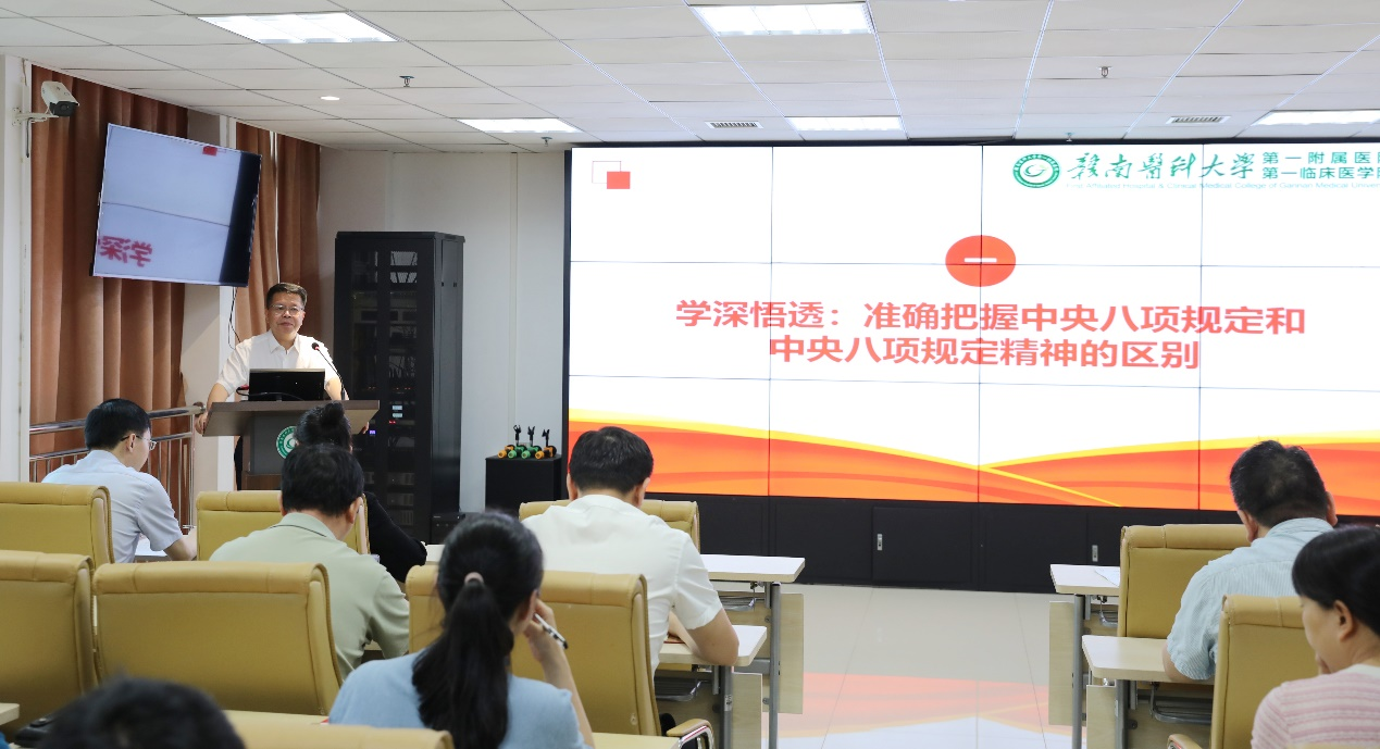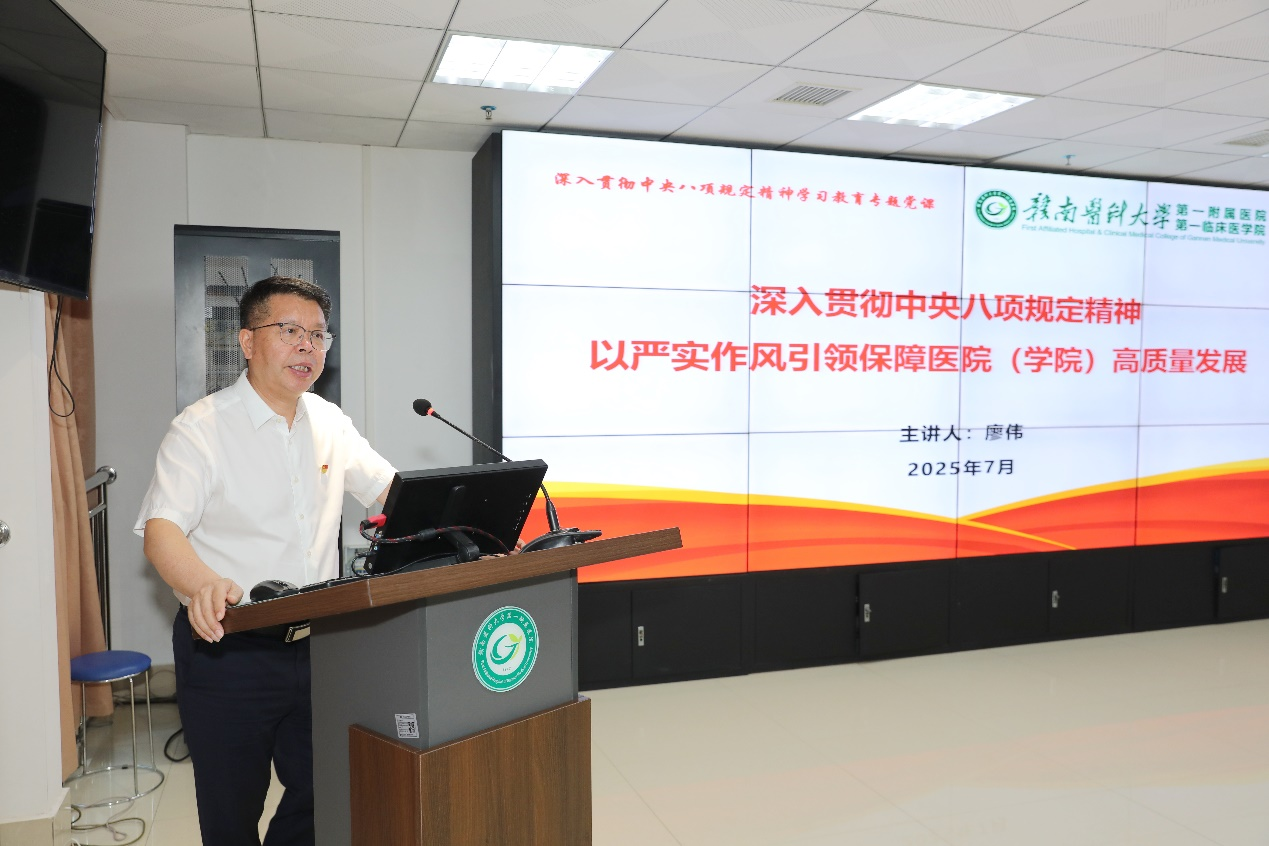 7月3日,学校党委常委、副校长,一附院(一临医)党委书记廖伟以《深入贯彻中央八项规定精神 以严实作风引领保障医院(学院)高质量发展》为题,为一附院(一临医)党员干部讲授深入贯彻中央八项规定精神学习教育专题党课。