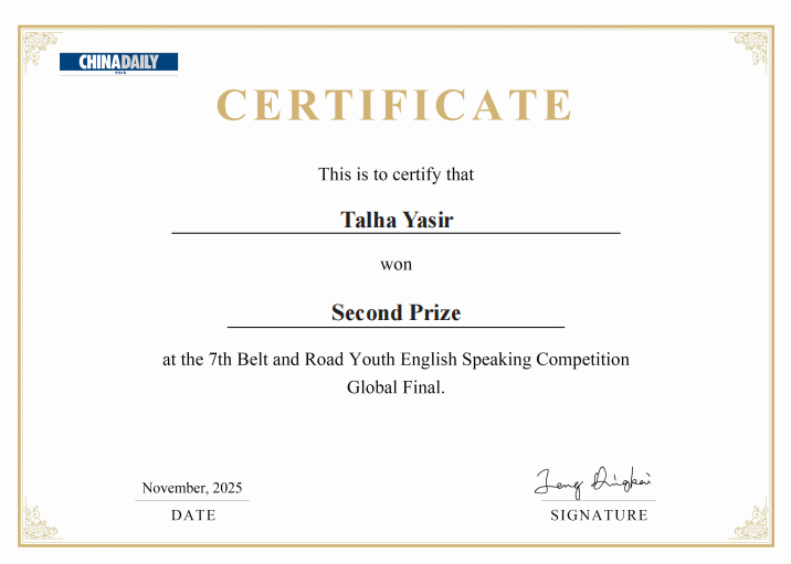 近日,由中国日报社主办的第七届“一带一路”全球青少年英语演讲总决赛在浙江杭州圆满落幕。我校2021级巴基斯坦留学生TALHA YASIR在比赛中发挥出色,凭借扎实的语言功底、深刻的主题阐述与流畅的现场表达,从众多参赛者中脱颖而出,荣获总决赛二等奖。这是他第二次参与此项高水平赛事,并成功卫冕该奖项,展现了我校留学生优秀的综合素养与稳定的竞技水平。
