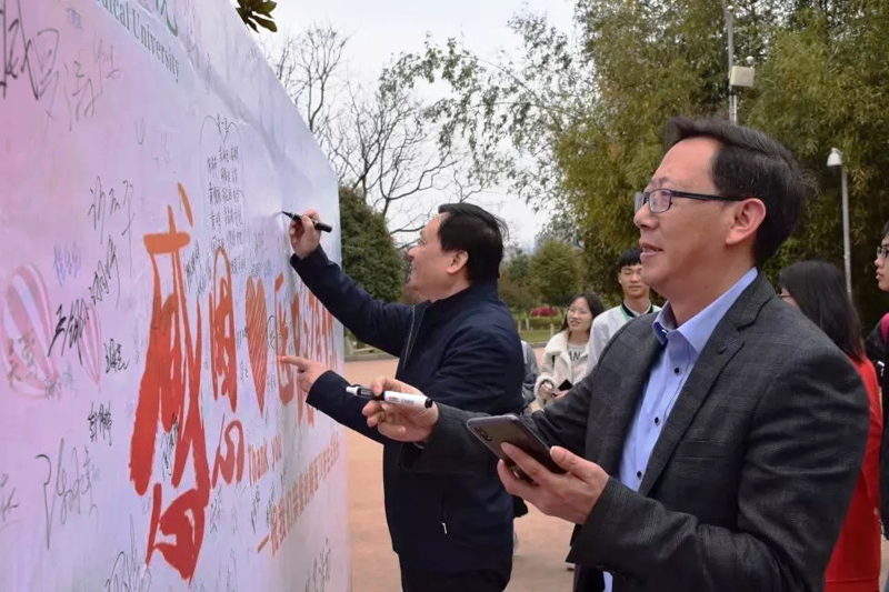 上午12点,学校青年志愿者们在黄金校区三叉路口搭起签名墙,开展“感恩医路有你”——庆祝建校78周年师生相互问好签名活动,路过师生纷纷驻足签名,写下对母校的感恩祝福。