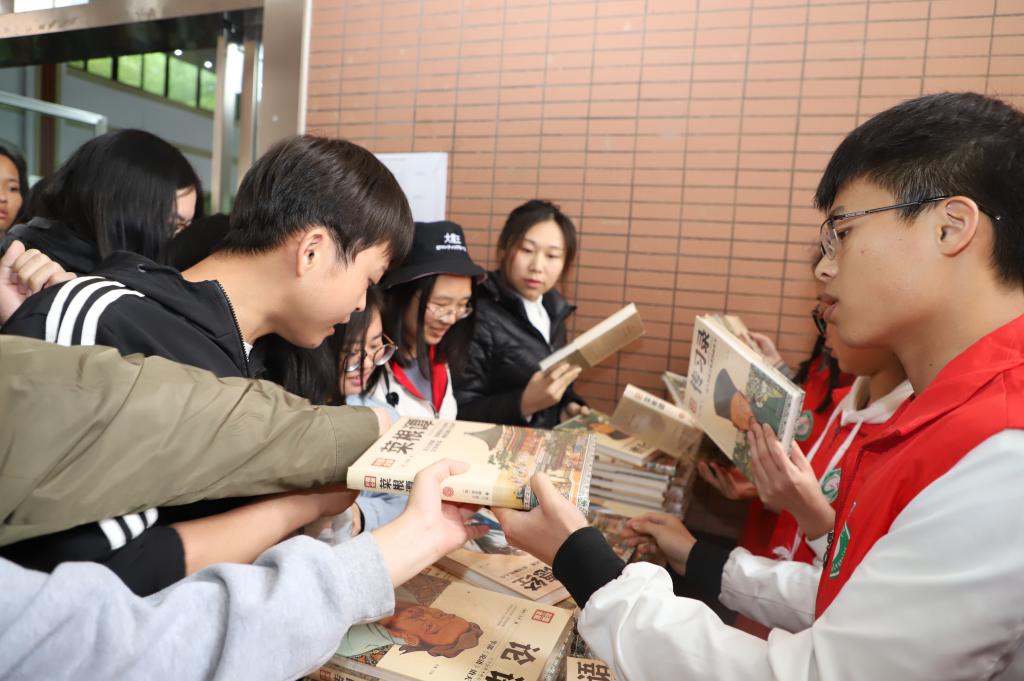康复学院2016级康复治疗学本科1班刘宇代表学生发言。捐赠仪式后,在场师生还现场领取了捐赠的《王阳明》《论语》《菜根谭》等图书。