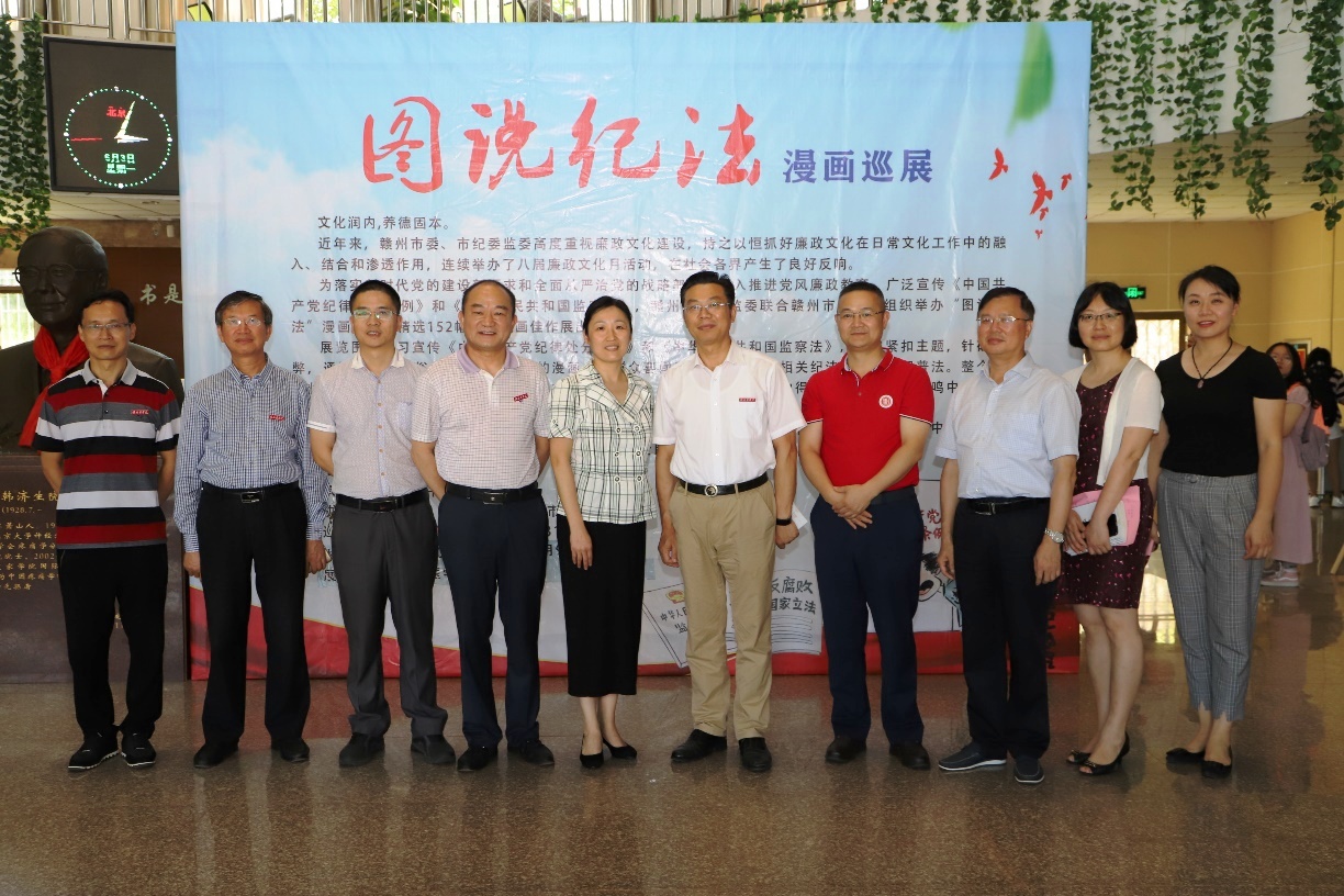 6月3日,由赣州市纪委、市图书馆主办的“图说法纪”漫画巡展在我校黄金校区图书馆一楼开展。赣州市纪委副书记黄华一行到场参观指导,学校党委副书记曾泽鑫、纪委书记肖树辉及相关部门负责人陪同参观展览。