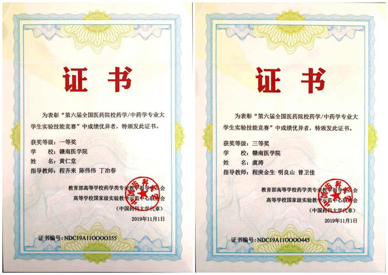 大赛由教育部高等学校药学类专业教学指导委员会主办,自今年6月启动以来,历时5个多月,10月31日至11月2日在河南中医药大学药学院顺利举行。大赛共有来自北京大学、武汉大学、四川大学、厦门大学等120多所高校700多名师生参与。大赛分实验理论笔试和实验技能操作两部分,经过两轮激烈比拼,由我校药学院教师程齐来、程庚金生带领的2016级药学专业学生黄仁堂、虞涛分别荣获大赛一等奖和三等奖,充分展现了我校大学生扎实的实验理论水平和动手操作能力。