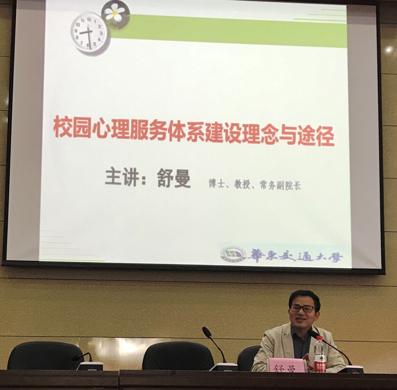 舒曼结合自己所做的工作,通过生动的例子,从政策指示、时代呼唤、学校要求三方面讲述了建设校园心理服务体系的重要性。并介绍了校园心理服务体系建设的基本框架,包括“积极心理学”视野,“立足于人,立足于情”两个立足点,“生活化、一小步、多元论”三种导向,“赞美、正常、构建、系统”四种思维。讲座期间,舒曼还同师生展开互动,带领师生体验心理健康教育小活动,气氛热烈。