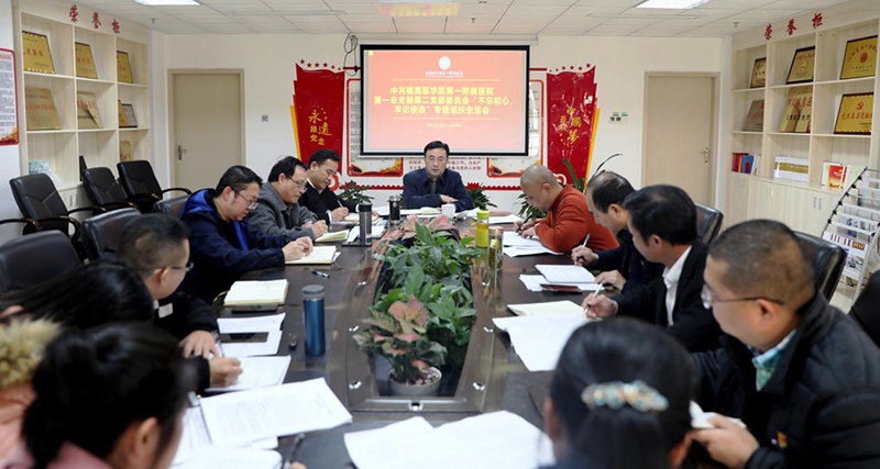一附院一总支二支部于12月2日在黄金校区召开“不忘初心、牢记使命”专题组织生活会。学校党委副书记、校长刘潜到会指导。一附院党委副书记、院长邹晓峰列席指导。一总支二支部全体党员参会。