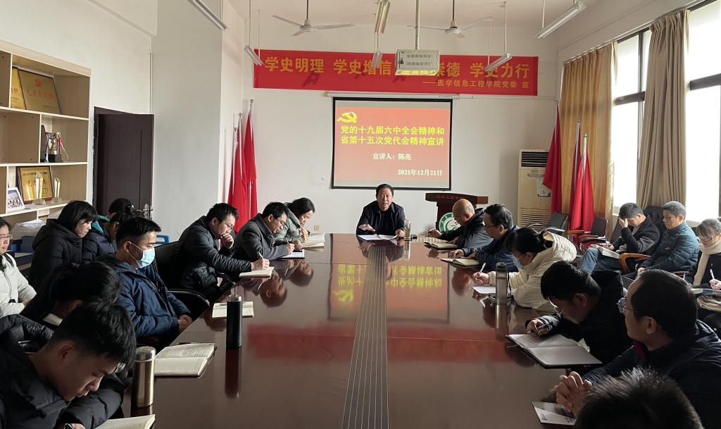 12月21日,学校党委委员、副校长陈亮到医学信息工程学院宣讲党的十九届六中全会精神和省第十五次党代会精神,该院教职工、学生第一党支部全体党员参加学习。