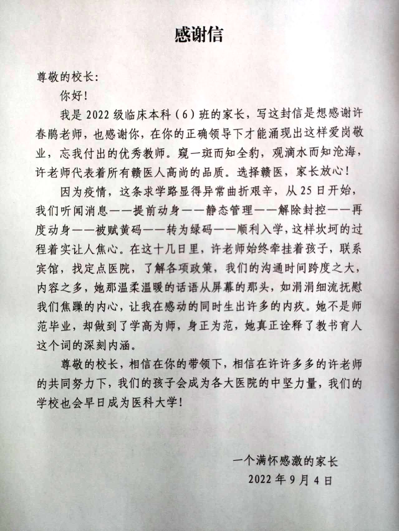 通过感谢信得知,写信的是2022级临床本科(6)班的一名学生家长,因为疫情原因,今年新生入学要落实的疫情防控要求更加严格。8月25日,该学生家长听闻江西省内有疫情的消息,怕受疫情防控影响,会导致入学报到延误,便提前动身,经历了静态管理、解除封控、再度动身、被赋黄码、转为绿码等一系列的防控流程才得以顺利入学,这样坎坷的过程让家长和学生十分焦心。作为班主任的许春鹃老师,在这十几天“漫长”的时间里,始终牵挂着学生和家长的行程和安全,为他们联系宾馆、找定点医院、了解各项政策、并耐心沟通,抚慰学生和家长焦躁的情绪,让学生和家长十分感动,也让他们感受到赣南医学院这个大家庭的温暖。