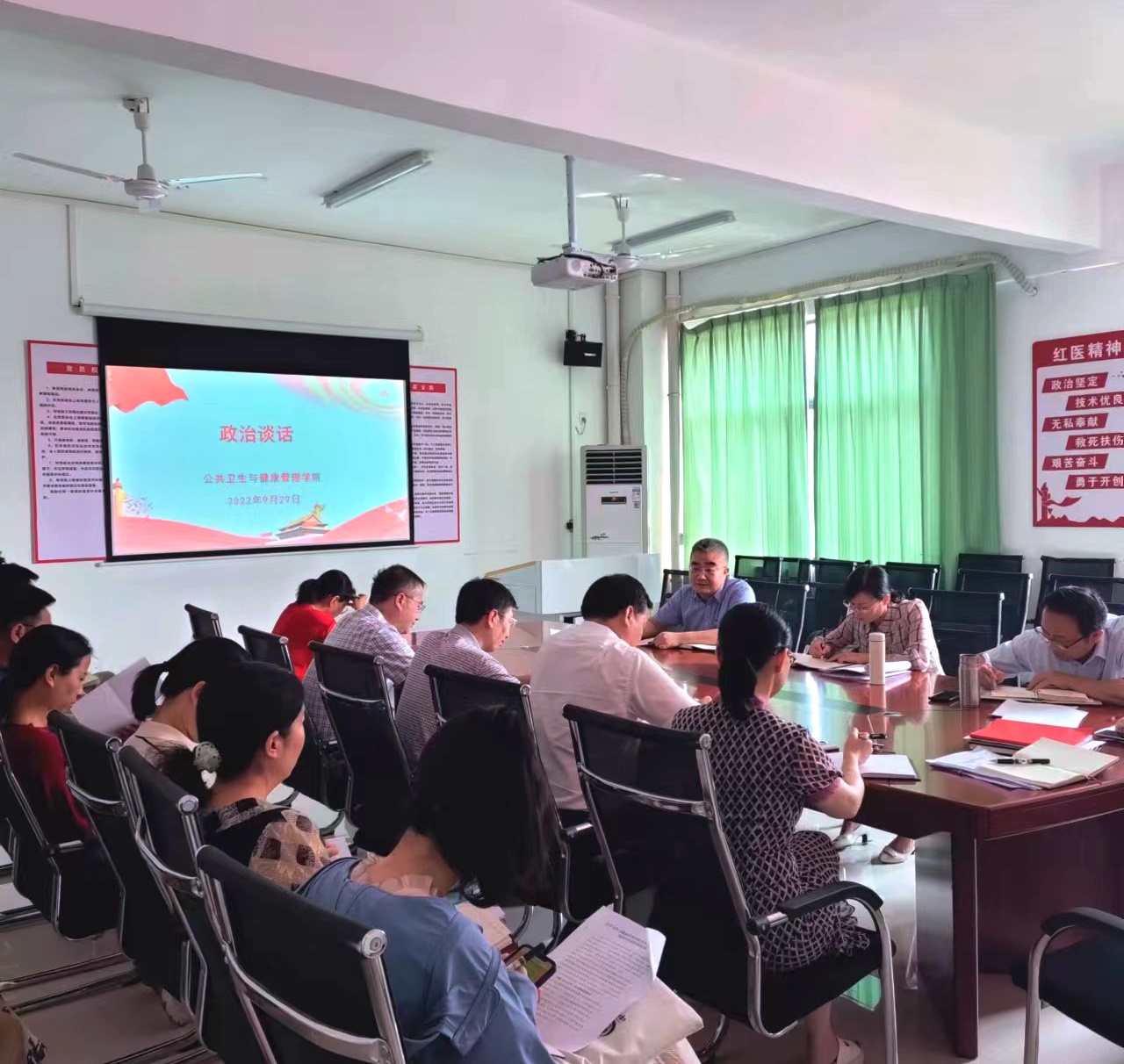 9月29日,公共卫生与健康管理学院党委围绕作风建设开展集体政治谈话,学院党委副书记邱伟主持,学院党政领导班子成员、各室主任、党支部书记参加。