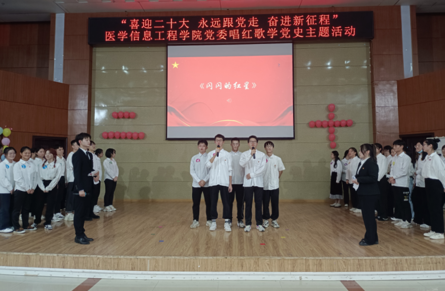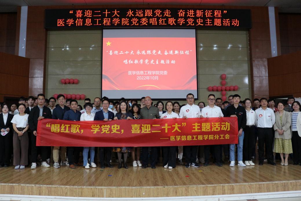 10月13日晚,医学信息工程学院在黄金校区开展“喜迎二十大,永远跟党走,奋进新征程”唱红歌学党史主题活动,该院党政领导、全体教师和学生代表400人参加。