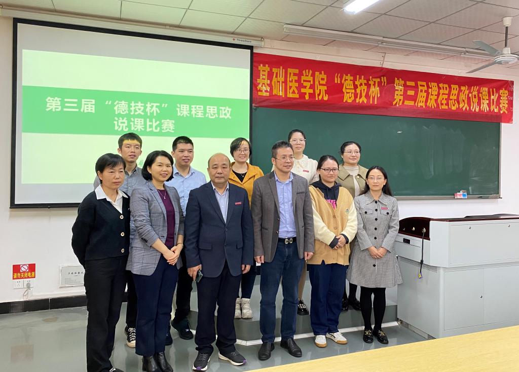 11月25日,基础医学院在第二教学楼举行“德技杯”第三届课程思政说课比赛。学校教学名师李启华及基础医学院副教授甘滔、胡志苹受邀担任评委。各科室教师现场观摩。