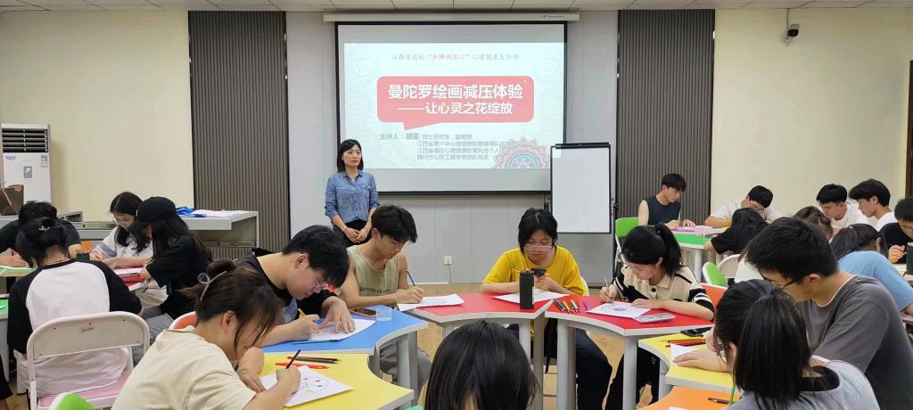 5月25日,为践行江西省“万师润万心”心理健康教育大行动,心理咨询中心专职教师胡雯为50余名志愿报名的学生开展了一场别开生面的“彩绘曼陀罗——学生心灵减压”讲座。