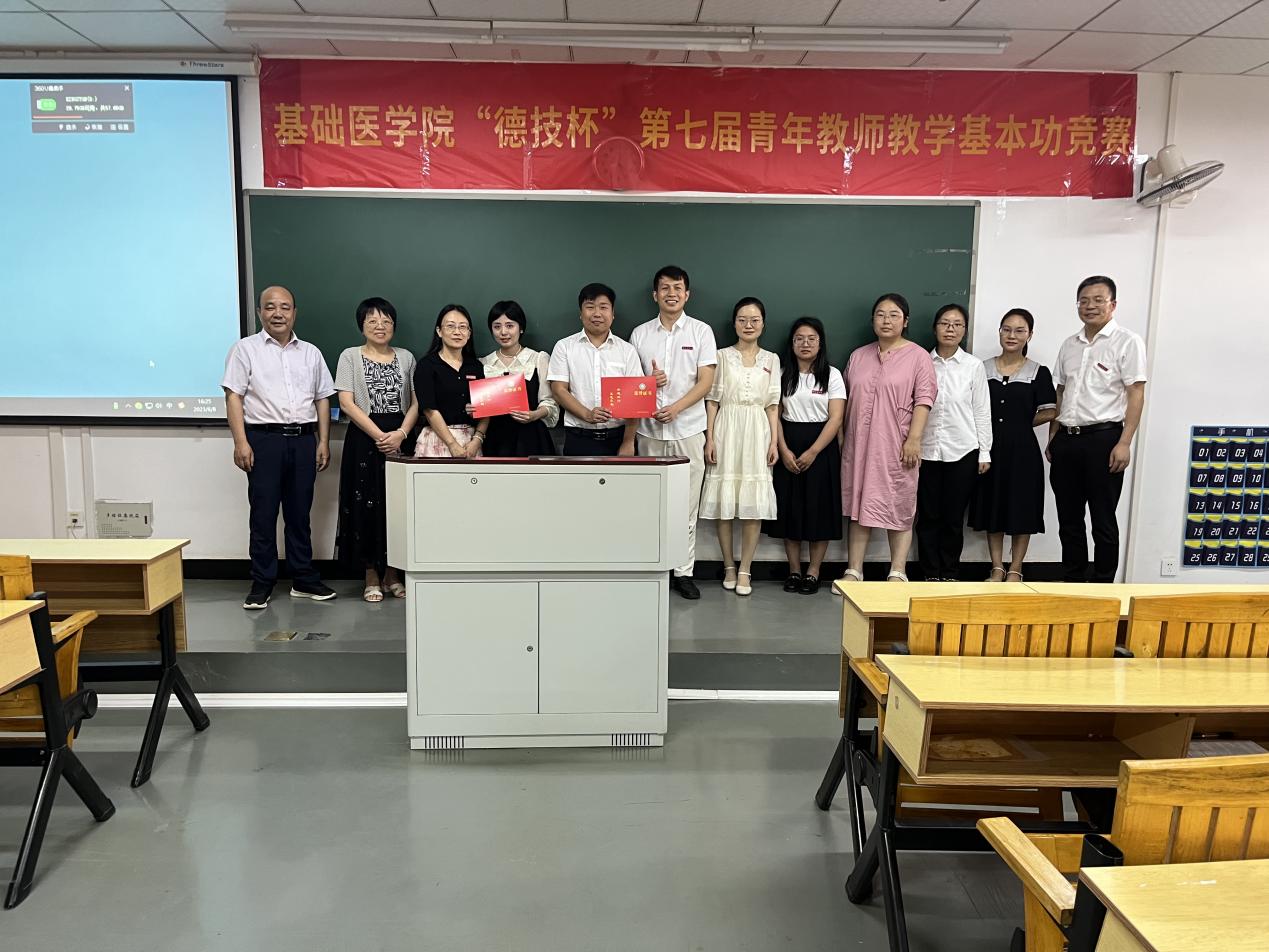6月8日,基础医学院举办了第七届“德技杯”青年教师教学基本功竞赛。竞赛邀请李启华教授、黄志华教授、胡志苹副教授担任评委,共有11位青年教师参加比赛。