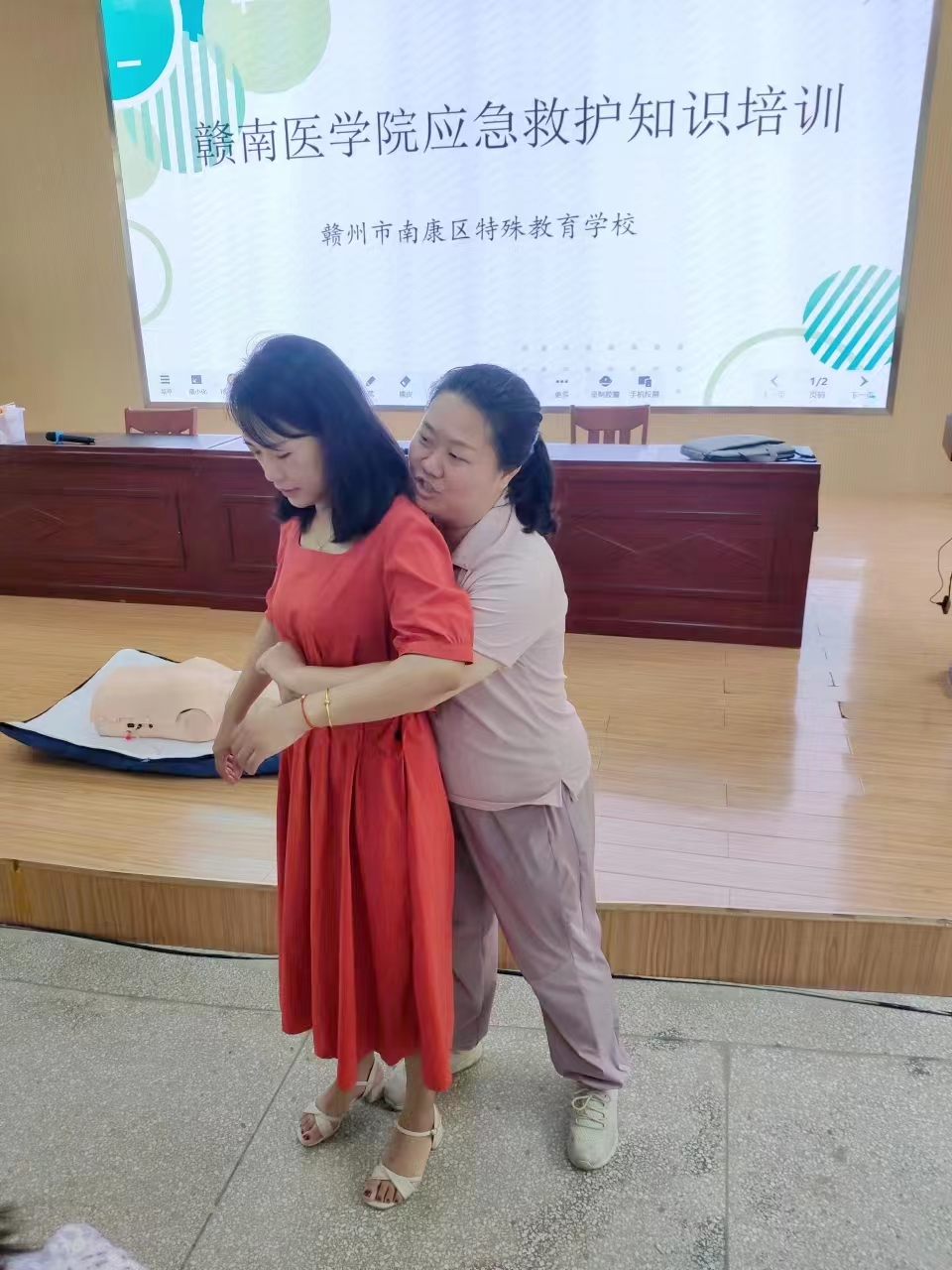 全科医学院社区医学教研室主任张琼为特殊教育学校教师进行“逃生避险”知识的普及宣传、实践培训,包括:心肺复苏、体外自动除颤仪的使用、创伤救护基本技能(止血、包扎、骨折固定及安全搬运)、煤气中毒的现场处理,海姆立克急救法口诀石头剪刀布的具体应用方法,提高了教师的自救防护能力。
