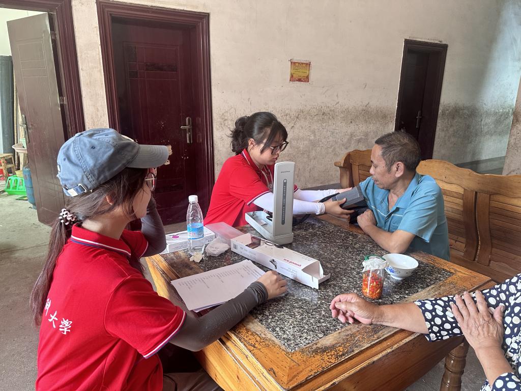 通过调研发现,多个村庄地处偏僻交通不便,空巢高龄老人较多,外出看病就医相对困难。为关爱老年人身体健康,实践队在村干部带领下,深入腿脚不便、年龄偏大的老年人家中,与老人亲切交谈,询问他们近期的身体、生活等各方面情况,为老年人测量血压,并为他们提供饮食和运动建议、赠送防暑降温用品,真正实现服务零距离。“我平时腿脚不是很方便,你们这些大学生能够上门来服务,真是太贴心了。谢谢你们!”家住竹溪村的李奶奶开心地说道。