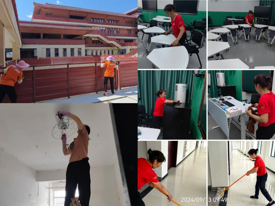 为给师生创造一个良好的学习生活环境,后勤绿化保洁中心不仅暑期放假“不打烊”,坚持做好清洁通风、消毒防害,清理楼栋、清洗窗帘风扇、垃圾清运等工作,在9月初,还对校园环境进行绿化美化,校园卫生开展精细保洁,在学校重点部位布花造景,迎新接待点、集中报到点设立宣传点,开展新生和家长的垃圾分类宣传工作,努力打造绿色后勤、文明后勤。新学期的校园清净优美、整洁舒适,让新生和家长赏心悦目、流连忘返。