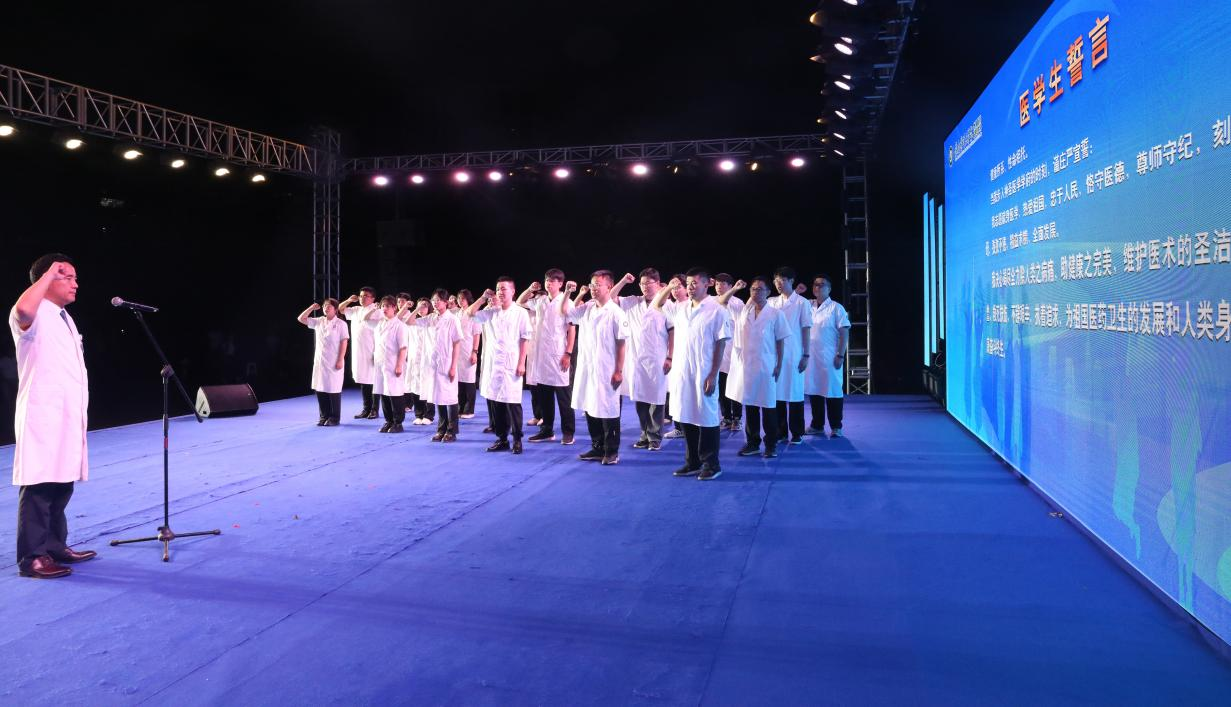 在邹晓峰领誓下,28名毕业生代表身着白大褂,与全场学子共同重温医学生誓言,铿锵誓言回荡夜空,彰显新时代红医的使命担当。典礼在《我们的明天》歌声中落幕,毕业生们带着母校“直挂云帆济苍生”的期许,迈向守护人民健康的新征程。