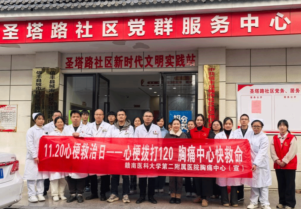 为深入学习贯彻党的二十届四中全会精神,扎实推进“红医领航·医心为民”党建品牌创建工作,传承红色医脉、践行医者初心,进一步提升公众对急性心肌梗死的认知,降低心梗致死致残率,11月20日,二附院内科第一党支部联合该院胸痛中心在信丰县圣塔路社区开展“11·20心梗救治日”主题义诊暨宣教活动,以党建红引领医疗蓝,把优质医疗服务送到群众“家门口”。