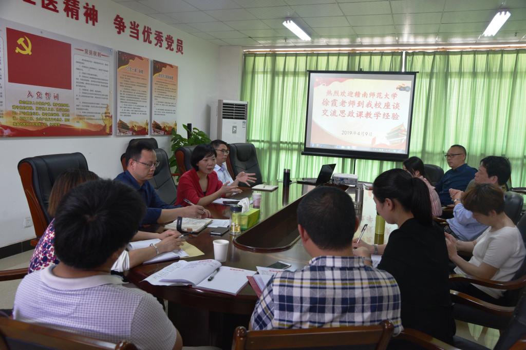 会前,该院邀请赣南师范大学徐霞老师前来座谈交流,分享了她参加全国学校思想政治理论课教师座谈会的感想。该院党总支书记谭宗梅要求全体思政课教师要认真学习领会李恭进书记的讲话精神,齐心协力,努力加强思想政治理论课建设,推进思想政治工作“五项工程”,为造就德技双馨良才,办好人民满意的医科大学贡献力量。