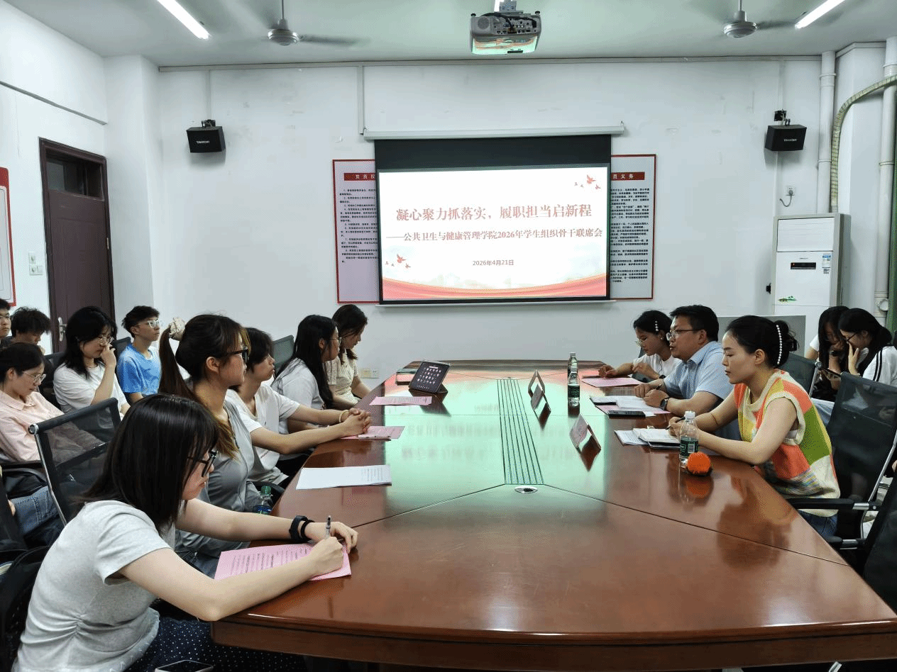 为进一步加强学院学生组织建设,统筹推进蓉江与龙南两校区学生工作协同开展,4月21日,公共卫生与健康管理学院召开2026年学生组织骨干联席会。本次会议采用线上与线下相结合的形式,该院党委副书记曾发挥、团委书记胡丹、学生工作办公室副主任邢宇及全体学生组织骨干参加。