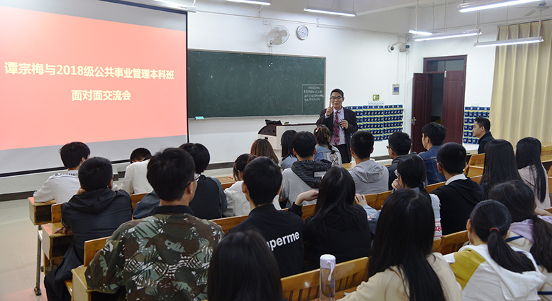 11月14日,马克思主义学院党总支书记谭宗梅与2018级公共事业管理专业本科班全体同学见面交流。