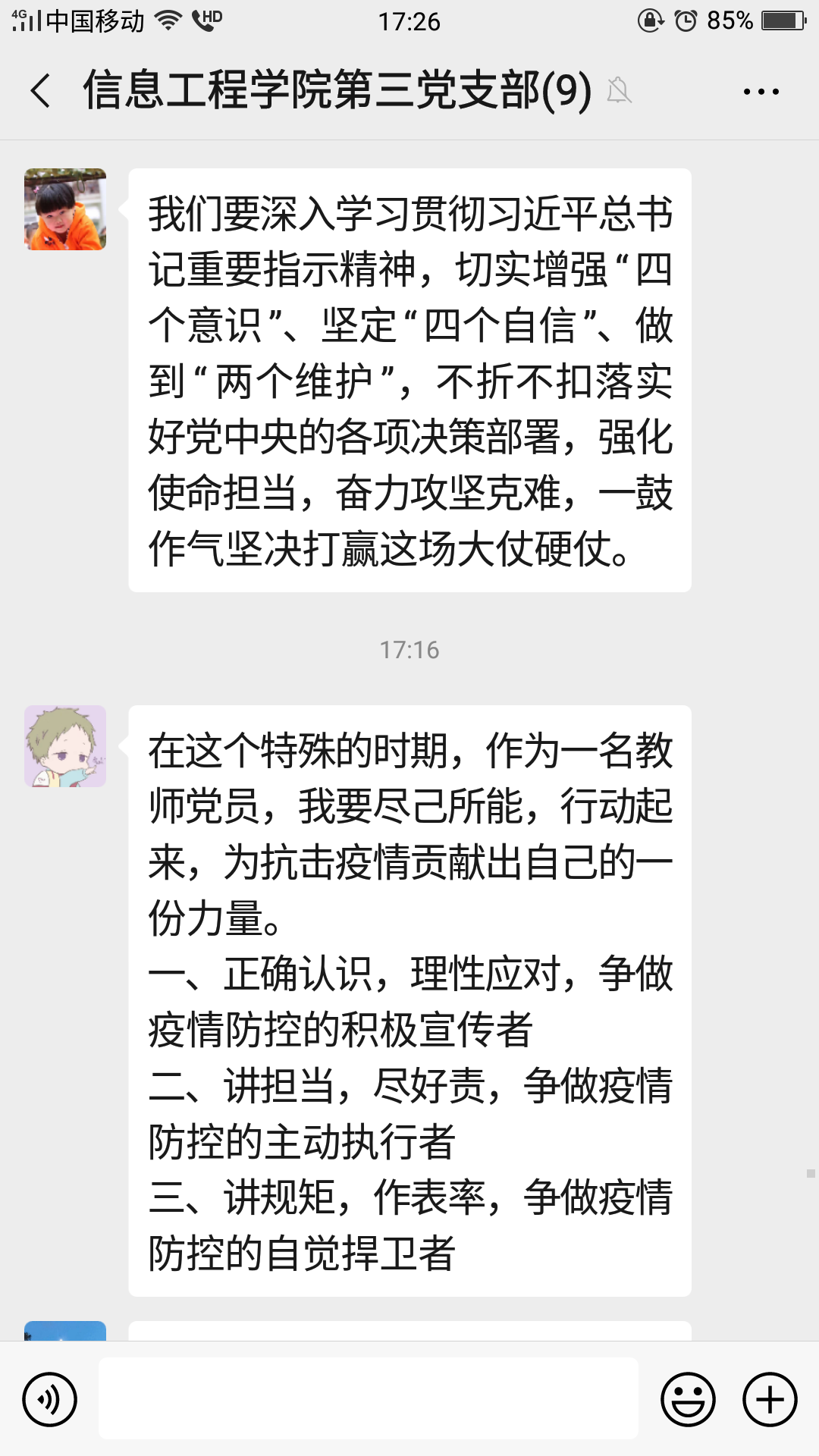 党员在会议中积极发言,表示坚决和党中央步调一致,教师党员明确做好自身防护和学生、身边群众的防护宣传,积极备课保证完成课程线上教学工作;学生党员表示坚决服从学校防疫工作统一部署安排,积极传递正能量。全体党员信念坚定,相信在党中央的坚强领导下定能战胜病毒,打赢疫情防控阻击战。