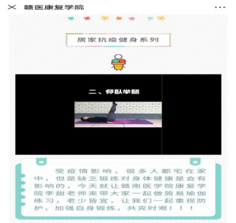 该院还利用学院专业优势,面向全校师生制定《新型冠状病毒防疫学生居家锻炼指南》录制居家锻炼指导视频作为战"疫"行动,增强师生身体素质,确保全体师生能以阳光健康的身心状态抗击疫情。