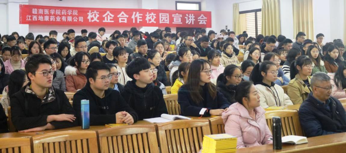12月20日上午,江西地康药业有限公司在黄金校区举行地康班组建的校园宣讲会。地康药业董事长王军、总经理陈志敏、副经理汪欣源亲临现场进行宣讲,药学院党委书记陈霖柏、副院长赖日勇以及辅导员、班主任代表和2018级、2019级200余名学生参加了本次宣讲会。宣讲会由赖日勇主持。