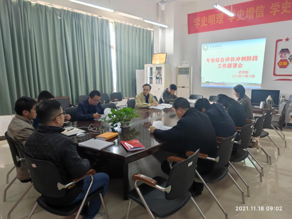 11月18日,药学院在黄金校区召开了省专业综合评价冲刺阶段工作部署会。会议由该院副院长丁冶春主持,各专业负责人及各专业综合评价工作材料收集整理人员参加。