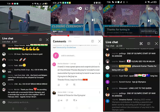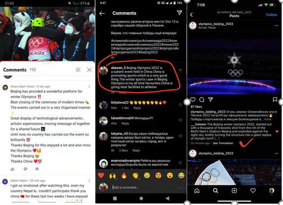 2020级留学生伊布拉从入学开始就深深喜欢中国文化,他在Youtube直播平台留言说,祝贺中国成功举办了2022年冬奥会,北京冬奥会向世界传递了和平、同一个世界、同一个梦想,完美诠释了团结、拼搏的奥林匹克精神。2020级学生艾曼在闭幕式直播平台留言说:“感谢中国为全世界举办了一次如此成功的冬奥会,并无时无刻传递着‘我们在一起’的温馨。”