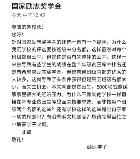 1.根据《赣南医学院国家励志奖学金评选实施办法》,我校国家励志奖学金名额是下达给各个学院的,实行等额评选。具体评选方法由各学院根据其实际情况制定,但是所有的推荐人必须经过班级评议小组评议后产生。