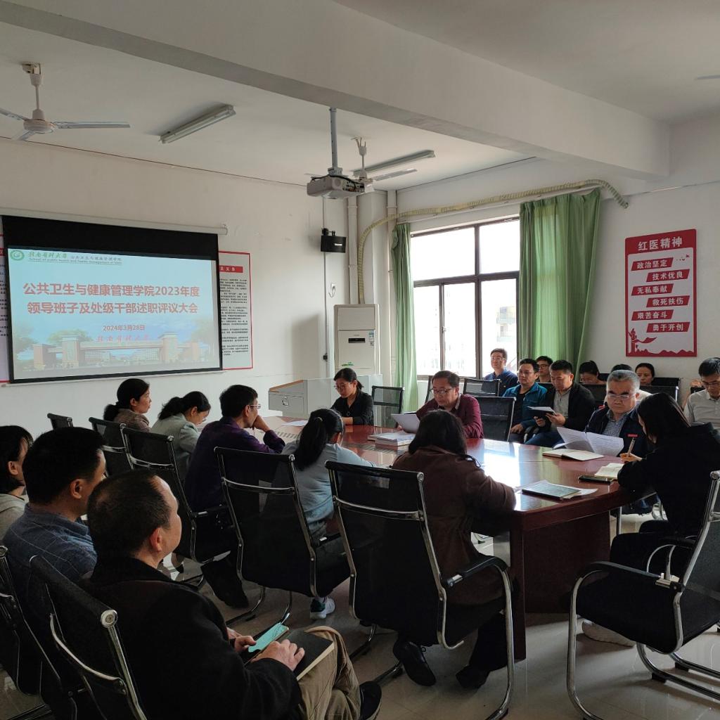 3月28日下午,公共卫生与健康管理学院召开了2023年度领导班子及处级干部述职评议大会,该院领导班子成员、全体教职工及学生代表参加会议,学校考核小组到会考核测评。会议由该院党委书记邱伟主持。