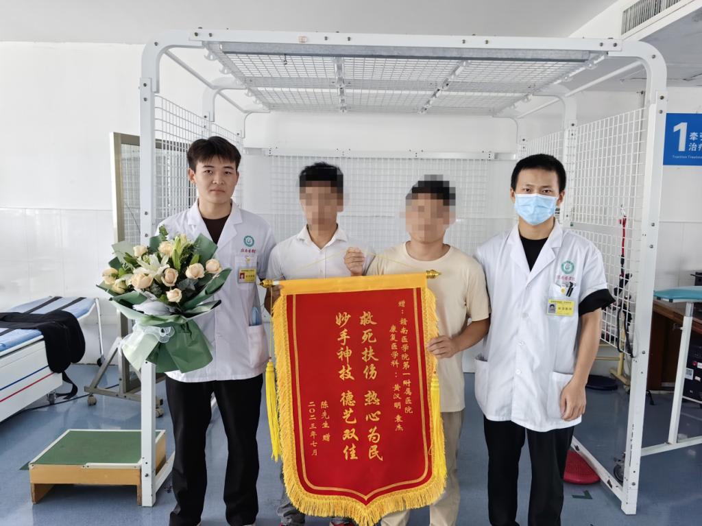 “还好有你们的救助,挽救了我的生命,感谢你们”,7月17日上午,在一附院章贡院区康复医学科,溺水后出院的陈先生紧紧握住黄汉明、袁杰同学的双手,心情非常激动说。并将写有“救死扶伤,热心为民;妙手神技,德艺双佳”的锦旗送给2位同学。