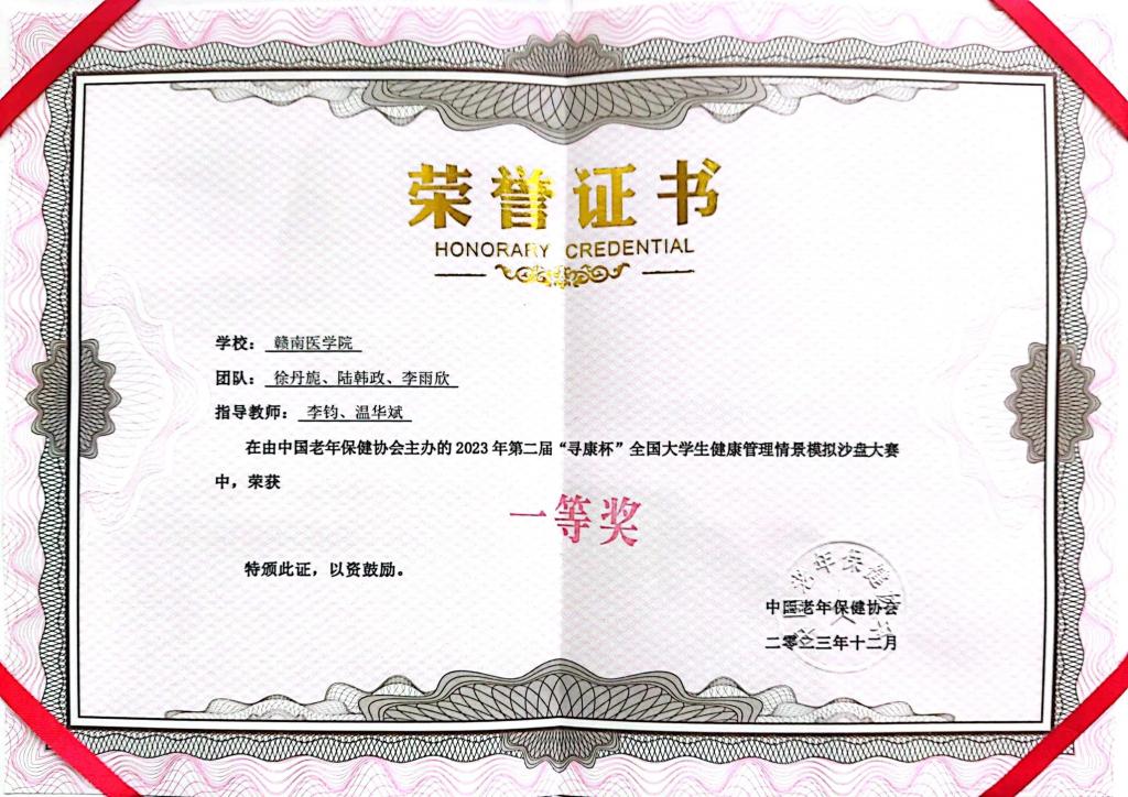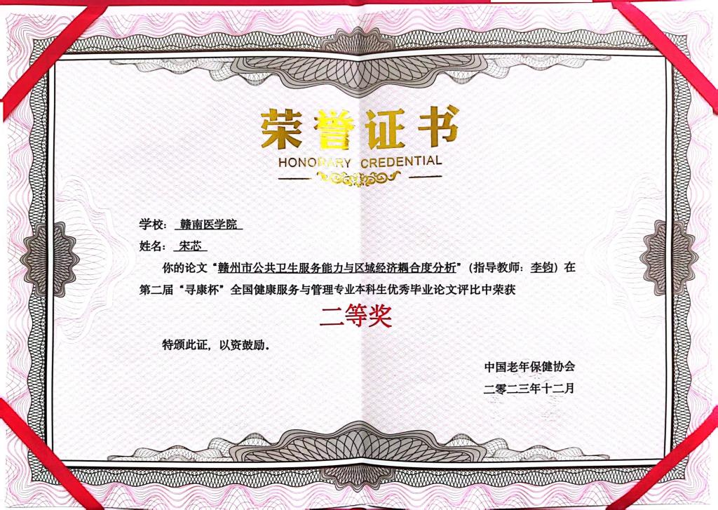 在首届全国本科院校健康服务与管理专业优秀毕业论文评比中,由公共卫生与健康管理学院吴清锋教师指导的罗炫宁同学毕业论文《赣州市和武汉市高校大学生亚健康流行现状与影响因素研究》荣获全国一等奖,李钧、温华斌教师分别指导的宋芯、邹玉如同学毕业论文《赣州市公共卫生服务能力与区域经济耦合度分析》《乡村森林康养旅游游客需求及影响因素研究——以永修县云居山为例》均荣获全国二等奖。