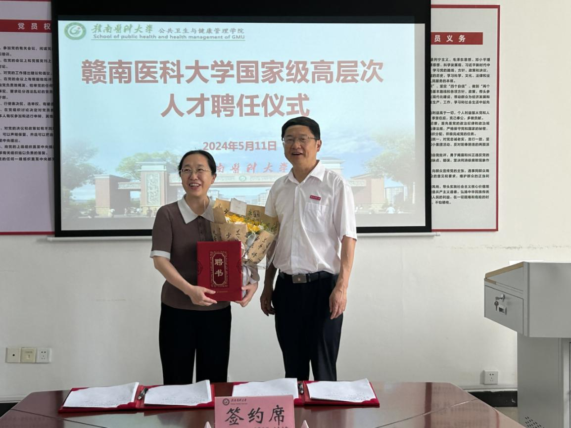 学校党委书记、校长张小康为陈卫红教授颁发聘书,人事处处长温金英代表学校与陈卫红教授签署了柔性引进高层次人才聘用协议,公共卫生与健康管理学院院长黄诚主持聘任仪式。