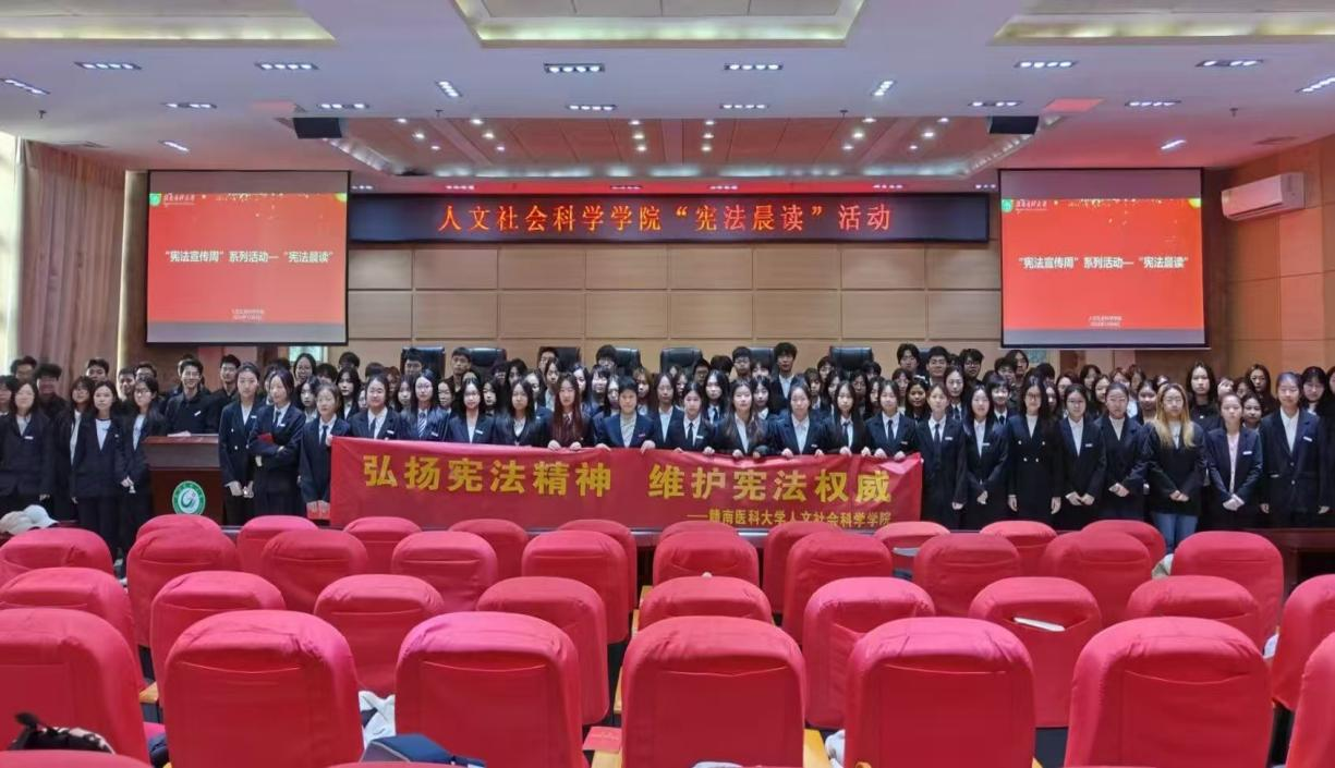 12月4日是第十一个国家宪法日,人文社会科学学院全体法学生进行了宪法宣誓。宣誓活动中法学专业学生全体肃立,奏唱国歌,在24级法学专业熊悦涵同学带领下,全体学生高举又拳庄严的立下誓言“忠于中华人民共和国宪法,维护宪法权威,履行法定职责……”,铮铮誓言是对宪法的尊崇和敬畏。