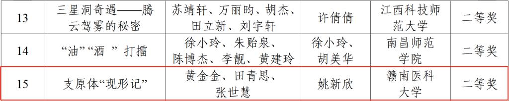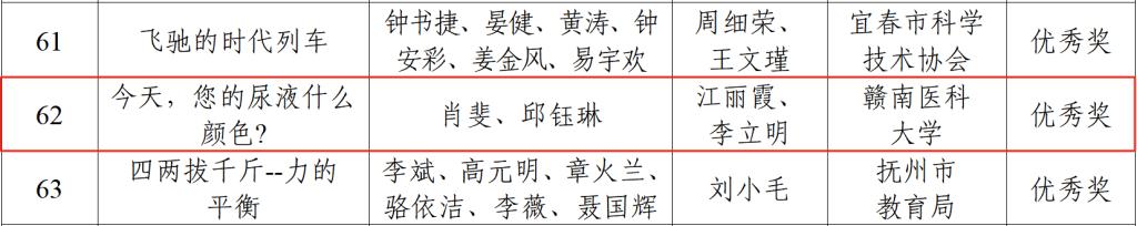 近日,江西省科学技术厅公布了第二届江西省科学实验展演汇演活动获奖名单,我校2项实验作品在此次展演活动中获奖,其中实验作品《支原体“现形记”》凭借生动的实验操作荣获二等奖(指导老师:赣南创新与转化医学研究院姚新欣老师,团队成员:2022级公共卫生专业研究生黄金金、田青思、张世慧),实验作品《今天,您的尿液什么颜色》荣获优秀奖(指导老师:第一附属医院检验科江丽霞、李立明老师,团队成员:2021级医学检验技术专业本科生肖斐、邱钰琳)。