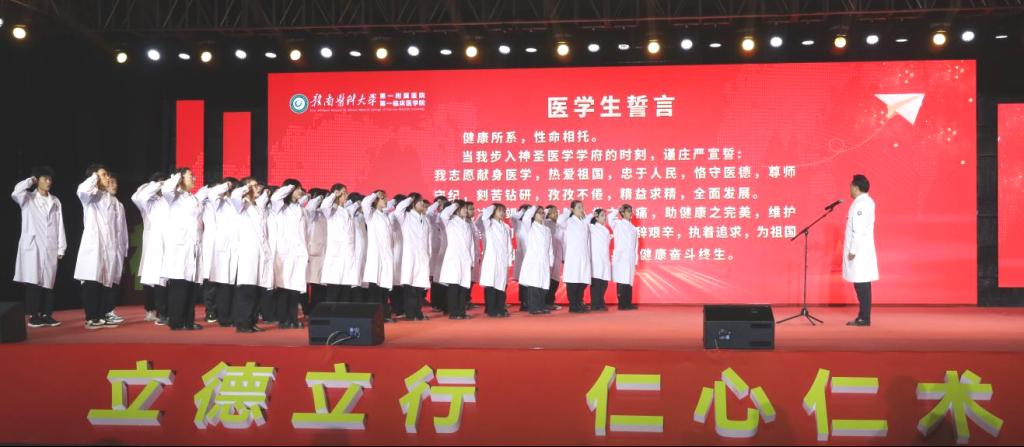 在院长邹晓峰的带领下,全体新生进行了医学生誓言宣誓。
