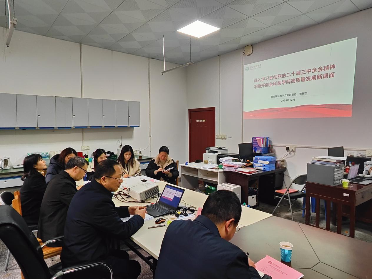 12月27日,学校党委副书记黄瑞忠深入全科医学院宣讲党的二十届三中全会精神。该院党政领导、教工支部党员和教职员工参加,会议由该院党委书记廖信伟主持。