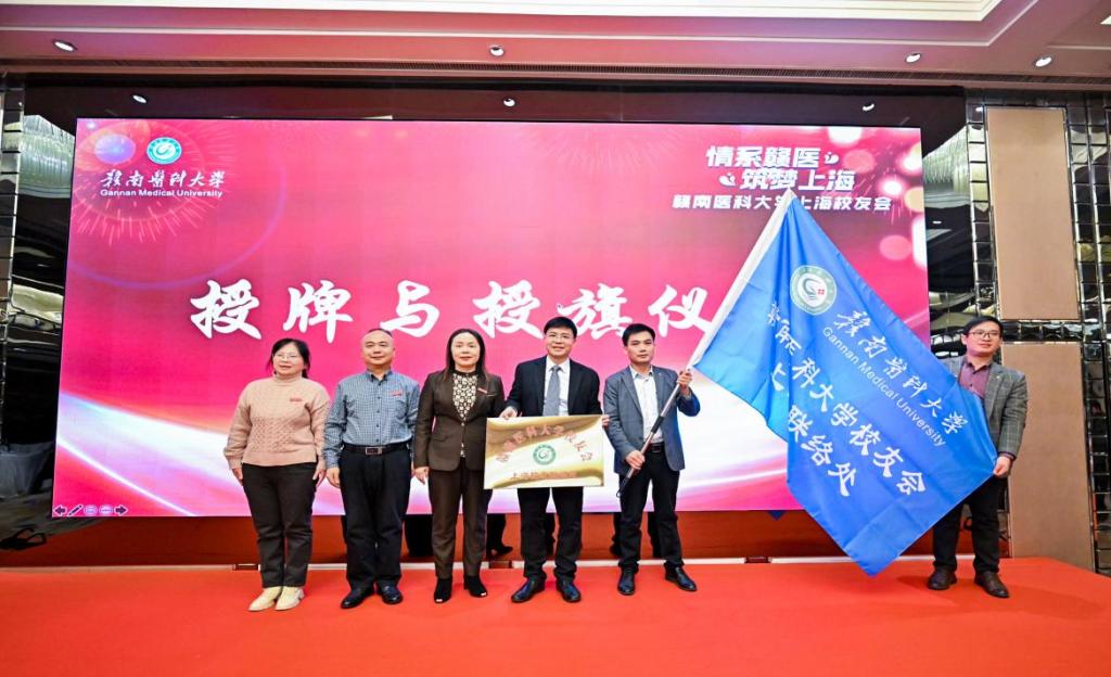 黄春平在宣读《关于同意赣南医科大学校友会上海联络处新一届组成人员名单的批复》文件后,为上海联络处授牌授旗。