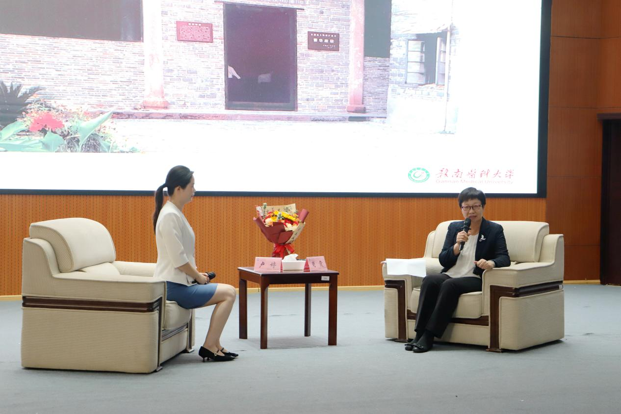 思政课上,萧霞与我校马克思主义学院教师卢婷以《革命理想高于天》为题,为同学们带来了一堂别开生面、引人入胜的“双师同堂”访谈式红色文化课堂。课堂采用“访谈+影像+互动”的多元形式,萧霞结合自己的亲身经历和深入思考,深情讲述了父亲萧华将军在中央苏区和长征途中艰苦卓绝的革命斗争历史,通过珍贵的历史照片及《长征组歌》创作历程,生动还原了这位“娃娃司令”的峥嵘岁月。
