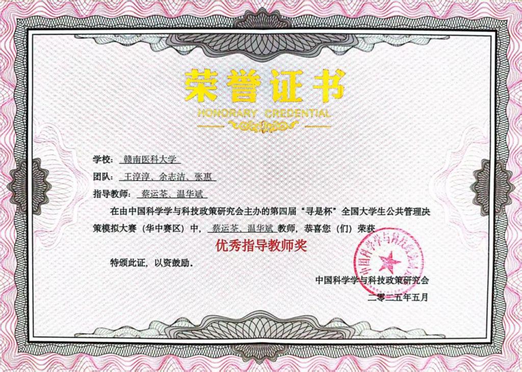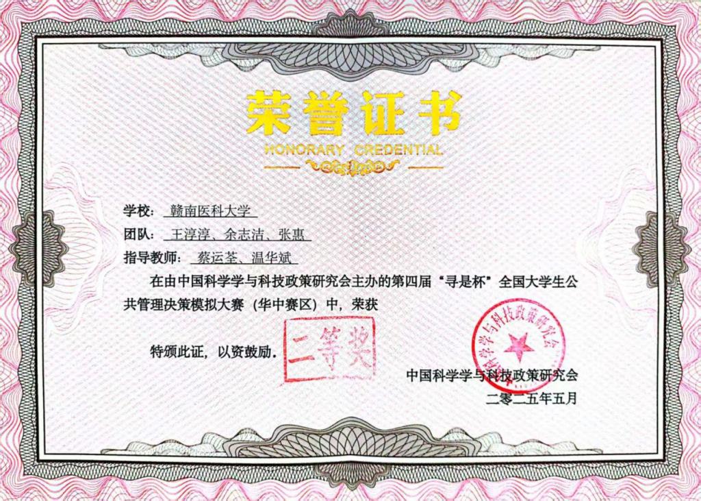 经过公共管理方案设计和公共管理决策演练沙盘对抗等环节的激烈角逐,由我校公共卫生与健康管理学院蔡运荃、温华斌两位教师指导的公共事业管理专业学生王淳淳、余志洁、张惠组成的队伍荣获二等奖,蔡运荃、温华斌两位教师荣获优秀指导教师奖。