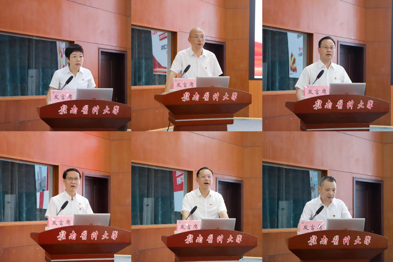 会上,基础医学院、医学信息工程学院、马克思主义学院、第一附属医院(第一临床医学院)、第二附属医院(第二临床医学院)、第三临床医学院(第三附属医院、附属口腔医院)等6个下属党委书记代表以及机关第九党支部、康复学院研究生党支部、护理学院本科生第一党支部、公共卫生与健康管理学院教工第二党支部、创新与转化医学研究院创新药物研发党支部等5个基层党支部书记代表就学习教育前一阶段开展情况和下一步工作打算进行了汇报。