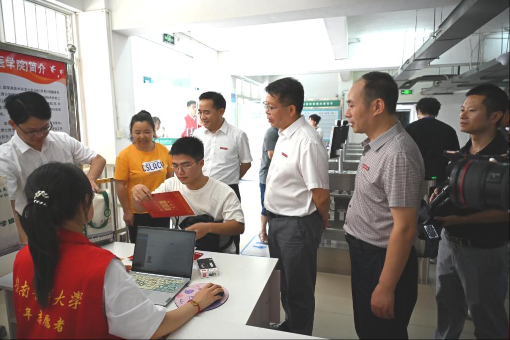 9月1日上午,我校黄金校区迎来临床医学专业交大医学班首批30名新生。学校党委书记、校长张小康,党委副书记黄瑞忠,党委常委、副校长、第一附属医院(第一临床医学院)党委书记廖伟,党委常委、副校长盛瑶环,党委常委、统战部部长赖传景携相关职能部门及第一临床医学院负责人深入迎新现场,察看报到流程与服务保障,走进宿舍与新生及家长亲切交流,对同学们加入赣医大家庭表示热烈欢迎,并对相关部门提出“高标准、精细化”的工作要求。