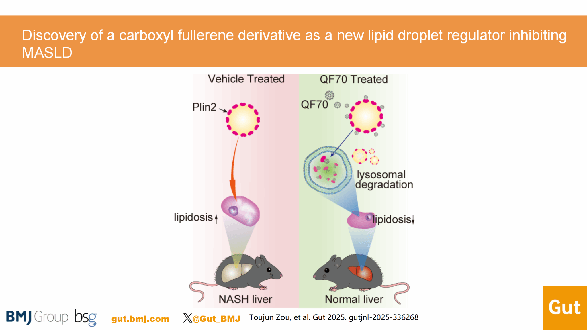 11月28日,赣南医科大学李红良教授团队在国际胃肠肝病学领域顶级期刊《Gut》(影响因子26.2)在线发表了题为《Discovery of a carboxyl fullerene derivative as a new lipid droplet regulator inhibiting MASLD》的重要研究成果。